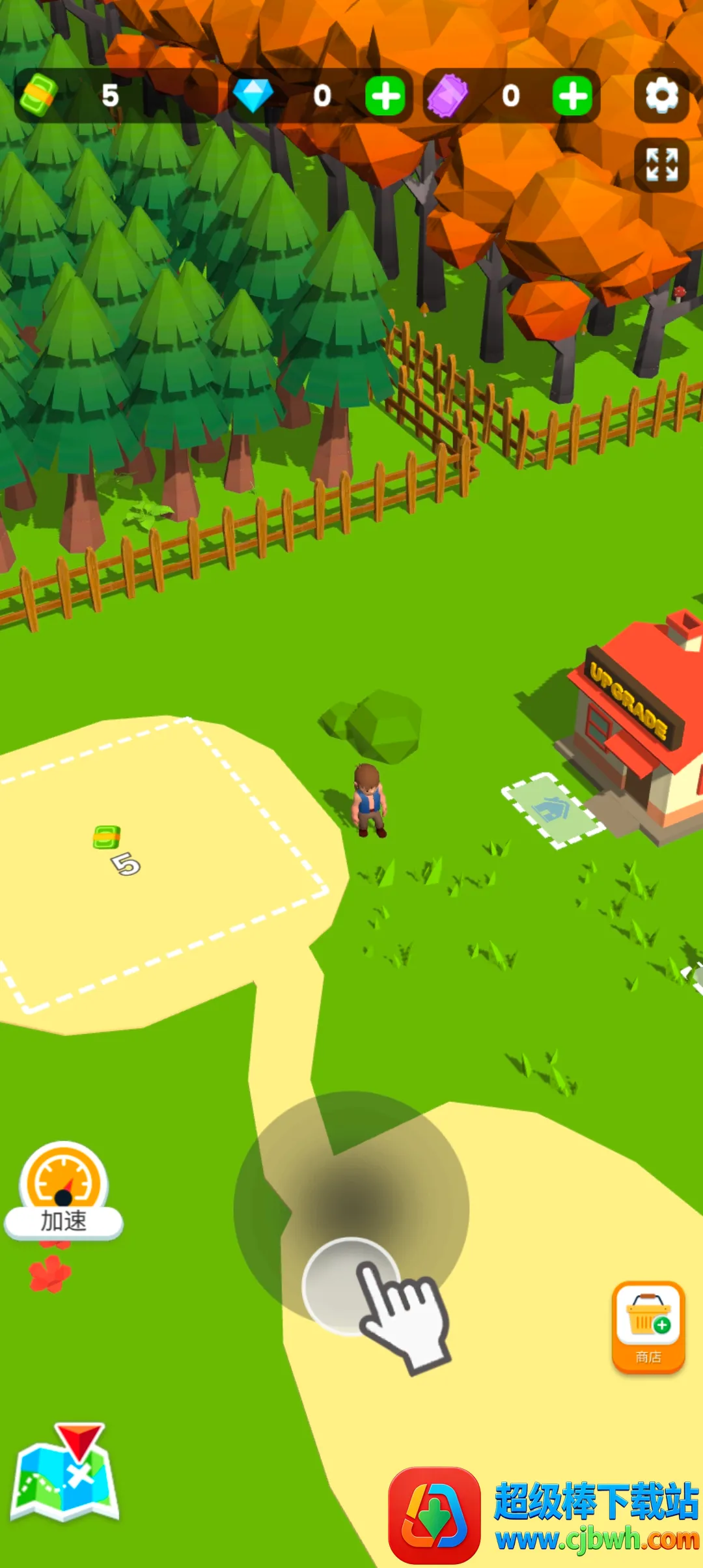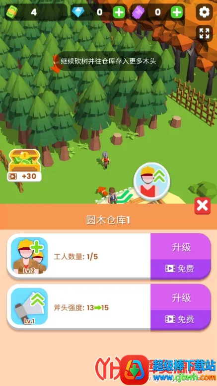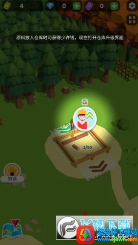 1、在游戏中,玩家能控制虚拟键盘移动人物,点击钞票解锁仓库,将砍倒的树木放置其中,还可升级仓库并雇佣伐木工。